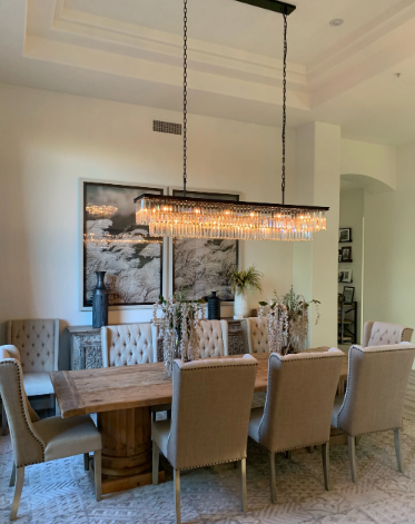 If you are hanging the chandelier above your dining table, you can also decide the size of the chandeliers based on the size of your dining table. We generally recommend that the width or diameter of the chandelier should be between 1/2 and 2/3 of the width of the dining table.